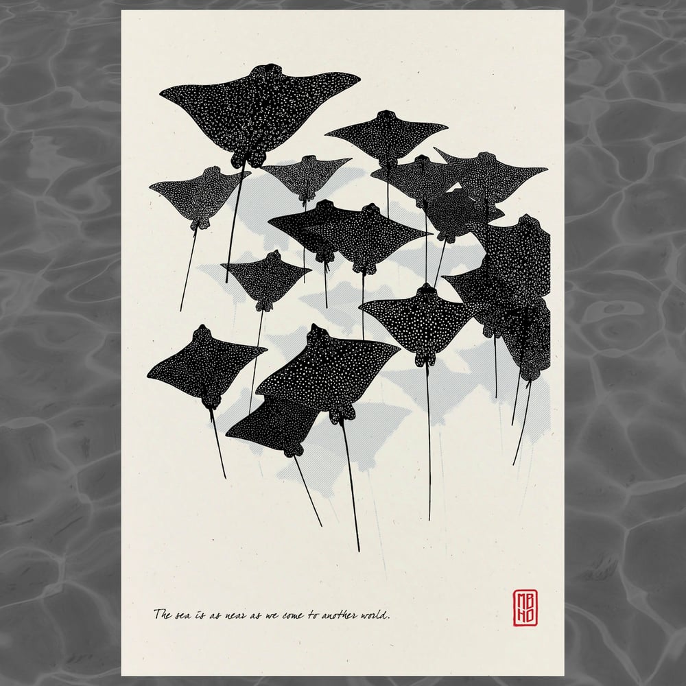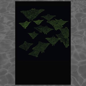 12" x 18" (frame-friendly!) • Edition of 75 • 4-color screen print on 100 lb. French Madero Beach cover stock. GLOWS IN THE DARK but this one is subtle.